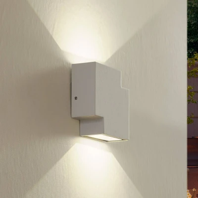 Lights.coModern LED outdoor wall light Fendir in white, angular design The Fendir LED outdoor wall light combines modern design with high functionality for outdoor areas such as terraces and balconies. The integrated LED light source provides energy-efficient lighting, while the IP54 rating protects the light from dust and splashing water. This white aluminium lamp, with a compact size, is not only a stylish lighting element, but also a long-lasting investment for any outdoor area.