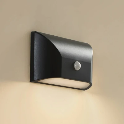 Lights.coSiana LED outdoor wall light with sensor made of black plastic The Siana LED outdoor wall light combines functionality with aesthetic modernity and provides optimal lighting in outdoor areas. With a high IP65 IP code, this light is protected against dust and water jets, making it ideal for balconies and terraces. The integrated LED light source is characterised by its energy efficiency and offers a long-lasting lighting solution. The integrated sensor increases safety and comfort by automatically activating the light as soon as movement is detected. This outdoor wall light is not only a lighting element, but also a modern accessory that emphasises the exterior architecture of your home. Technical data Sensor - Detection angle 160° - detection range 8m - optimum installation height 1.5m - 2m - light switch-on duration 7s - 8min