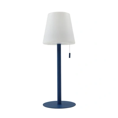 Lights.coFlexible Azalea LED rechargeable table lamp in blue for outdoor use Equipped with a blue aluminium base and white plastic shade, the Azalea table lamp produces a uniform light whose light colour can be adjusted using a discreet pull switch on the underside of the lampshade. The height of the table lamp can be adjusted thanks to the combination of two rod elements. It is powered by a rechargeable battery and can therefore be positioned flexibly; it only requires a power connection for charging with the enclosed USB cable. - with CCT function (light colour selectable in three levels: 3,000 K, 4,000 K and 5,000 K) - rod consists of two elements, therefore height-adjustable (30 or 45 cm selectable) - battery-operated lighting time 4 hours - battery charging time 2.5 hours - battery capacity 2000mAh - with pull switch