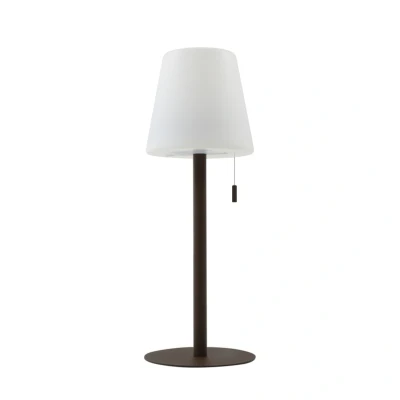 Lights.coHeight-adjustable LED battery table lamp Azalea in dark brown With a discreet, dark brown base and a white lampshade made of plastic, which emits a very even, glare-free light, the Azalea battery lamp is a real eye-catcher on any table. Its IP code of IP44 makes it suitable for outdoor use. It is battery operated and can therefore be used flexibly. The height of the table lamp can be adjusted by combining the two rod elements. A USB cable is included to charge the battery. This is plugged into the USB port below the lampshade, where the small pull switch is also located. This can be used to effortlessly switch the battery-powered lamp on and off and to adjust the light colour. - with CCT function (light colour can be selected from three levels: 3,000 K, 4,000 K and 5,000 K) - The rod consists of two elements, therefore height-adjustable (30 or 45 cm selectable) - Battery life 4 hours - Charging time of the battery 2.5 hours - Battery capacity 2000mAh - with pull switch