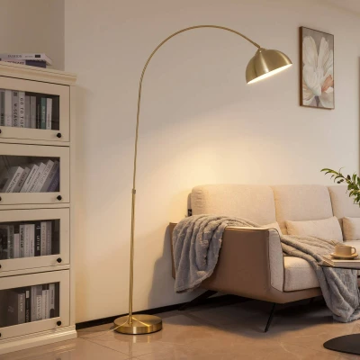 Stylish Lennart floor lamp made of iron in matt brass, curved shape The extraordinary colour scheme and the slim design speak for the Lennart floor lamp. A wide arc rises from its base and ends in a lampshade. The lamp body is made entirely of iron and has a matt brass finish. There is space for an E27 bulb inside the lampshade, which provides the necessary light and the lampshade guarantees glare-free illumination. To create the perfect ambience, we recommend using a filament bulb, which gives the whole thing a very special touch and has a classic incandescent look. The Lennart floor lamp has a cable switch that makes it easy to turn it on and off. Its narrow, curved arc is height-adjustable (141-183 cm) and allows for a certain degree of flexibility. This guarantees the right light at the right height at the right moment. It looks particularly good next to a couch and is the perfect companion for an evening of reading.