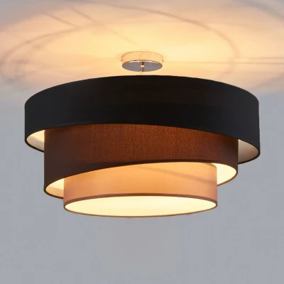 Melia three-colour ceiling lamp with three-layer textile shade A classic black, a dark brown and a lighter grey-brown are combined in the shade of this textile ceiling lamp. Although the lampshade has a dark appearance, it does not lack a cosy overall effect. Most of the light is emitted downwards because the rather dark lampshades are naturally not so translucent and the light can only escape unhindered where there is no fabric. For many rooms in modern interiors, the ceiling lamp with the partially slanted individual shades can be chosen as a suitable addition.