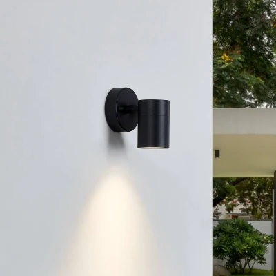 Outdoor wall light Inaye made of aluminium in a simple design This light fits on just about any outdoor wall to attractively illuminate your balcony, terrace or garden. The great look of the lamp offers numerous application and combination options and can be perfectly integrated into your outdoor furnishings. The outdoor light allows you to adjust the brightness to your liking, has an IP code of IP44 and is therefore protected against the ingress of solid foreign objects with a diameter greater than 1 mm and splashing water, and is made of aluminium. It blends in well with your outdoor area and creates a great flair. The outdoor wall light in a modern design is adapted to accommodate bulbs with a GU10 base. It provides a cosy flair with a light source. The outdoor wall lamp is black in colour. It is perfect for customising the lighting in your outdoor area, is a beautiful decorative element and adds extra flair to your interior. This lamp combines a high level of functionality with excellent design.