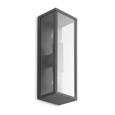 Lights.coDark Peldar outdoor wall light with two E27 sockets The Peldar outdoor wall light impresses with its special design. The housing is made of aluminium and has been painted dark grey so that it stands out visually from its surroundings. The lampshade is made of glass so that the two light sources can be easily seen from all sides. The sockets are directed upwards and downwards, which gives the light an interesting character. The user can choose the bulbs to be used as they please, but decorative lamps are recommended to accentuate the look of the light.