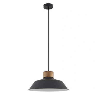Lights.coSingle-bulb Nefeli pendant light made of steel with attractive wooden details The Nefeli hanging light combines a sturdy steel design with delicate wooden details. Its steel lampshade has a sand-black surface and is connected to the suspension using a discreet wooden element. The inner wall of the lampshade is lined in white and surrounds a socket that can be fitted with appropriate bulbs. The Nefeli pendant light is ideal for installation in a living room or in a dining room above the table. The combination of steel and pine wood gives the light a special look that creates striking accents within the interior design.
