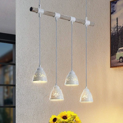 Special pendant lamp Pimana with four ceramic lampshades This interesting pendant lamp comes in a simple yet fascinating style. Its ceiling mount as well as the horizontally aligned beam are made of steel, whereby the beam was clad in a beautiful wood decor. Four downward-opening lampshades made of ceramic are attached to it. The surface finish in white looks discreet and elegant. This lamp looks very nice above a larger dining room table and brings coziness into the living room.