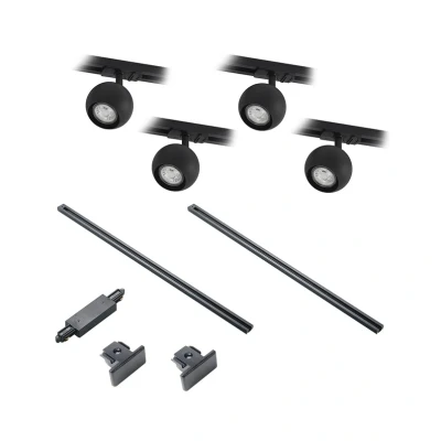 ManoManoGeneral description This modern Linaro single-circuit track lighting system features an elegant black design and includes four movable spotlights. It is perfect for creating a cozy and warm atmosphere in your home, whether in the living room, dining room, or office. The stylish industrial design adds a nice touch to any modern loft, apartment, or house. Technical specifications Type: Single-circuit track lighting system Color: Black Bulb type: GU10 Number of bulbs: 4 Track length: 2 x 1 meter Includes: 2 end caps, 1 longitudinal connector, and matching adapter Compatibility and accessories Expandable with matching components available as accessories Installation Includes all necessary components for installation Usage Easily dimmable with an extra dimmer switch (not included) Provides targeted, bright illumination Other information