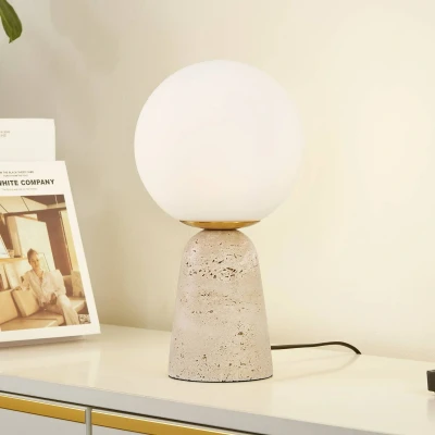 Lights.coKirstan table lamp with a spherical shade Discover the Kirstan table lamp with its modern design and harmonious colour combination of beige and white, an enrichment for any living room, dining room or bedroom. The high-quality finish of the glass reflects the light in a way that can create both calming and energising effects. With the combination of glass and stone, you not only bring light, but also style and elegance into your rooms.