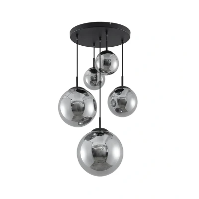 Lights.co5-bulb Teeja pendant light with smoky grey glass spheres This pendant light adds that certain something to the living area and is a remarkable light source with five spherical glass shades. Some of the five smoked glass spheres are of different sizes and also hang from the ceiling at different heights, so that the appearance is characterised by a certain dynamism and variety. The lighting has a pleasant and cosy effect, whereby the bulbs can be clearly seen behind the glass, so that they have a strong influence on the overall appearance and should be selected accordingly. LED filament bulbs are very suitable here, especially as they are considered energy-saving thanks to LED technology. In the 5-bulb version, the hanging light can provide good brightness in the living area.