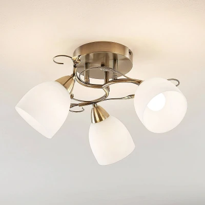 3-bulb Thaddeus ceiling light with white glass shades and a frame in antique brass You can see at first glance how well the Thaddeus ceiling lamp fits in with classic living styles. This is partly due to its playful look and the curved metal elements that lead to the lampshades and integrate leaf-look elements, and partly due to the antique-looking surface in antique brass. The three lampshades are made of white glass in a round shape and they distribute the light softly and evenly, just as you would expect from classic living room lighting.
