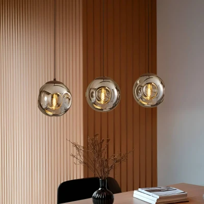 General description This stylish Lindby Valentina pendant light features a modern industrial design, perfect for enhancing the atmosphere of your living room, dining room, or office. Its elongated shape with decorative glass shades adds a unique touch to any modern space, making it an ideal choice for lofts, apartments, or homes. Technical specifications Type: Pendant light Material: Glass Bulb type: E14 Number of bulbs: 3 Color: Smoky grey Installation Requires installation of a dimmer switch for adjustable light intensity (dimmer switch not included). Usage Ideal for lighting dining or living tables. Creates a cozy atmosphere with light emitted all around through the glass shades. Decorative bulbs are particularly suitable as light sources. Other information