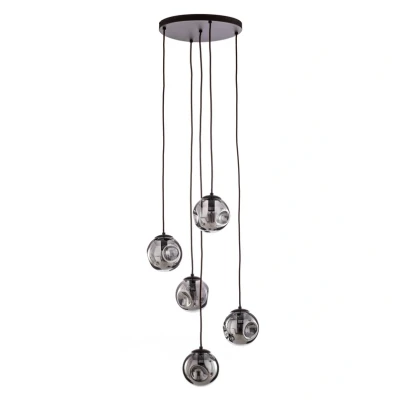ManoManoGeneral description This stylish Lindby Valentina pendant light features a modern industrial design, perfect for enhancing the atmosphere of your living room, dining room, or office. Its unique glass shades in a smoky grey finish add a charming touch to any contemporary space, making it an ideal choice for lofts, apartments, or houses. Technical specifications Type: Pendant light Number of bulbs: 5 Material: Glass Color: Smoky grey Shape: Round with decorative indentations Installation The lampshades hang down from a round canopy at different heights, allowing for a dynamic lighting effect. Usage Easily dimmable with an additional dimmer switch (not included), allowing you to adjust the light intensity to create a cozy atmosphere. Ideal for use in living rooms, dining rooms, or offices. Other information