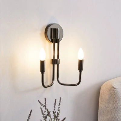 Dark Elanova wall light with two light sources Elanova is an interesting wall light with an antique-inspired design that is so minimalist that it can also be combined with modern styles. The frame is quite slim and is divided into two arms that point upwards. The light has been kept completely free of shades so that the bulbs to be used have a decorative effect. Candle-shaped and energy-saving LED bulbs with an E14 thread would be ideal here.