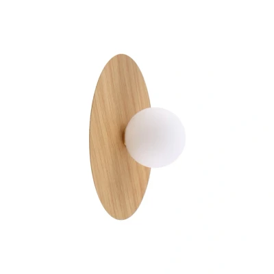 Lights.coRound Zain wall light with decorative wood decor The Zain wall light impresses with its round frame, which has a beautiful wood decor and thus brings a natural touch to the living area. The design is rounded off by a spherical white glass shade that spotlights the surrounding area with glare-free light. Zain can be used as a light source in the hallway, living room or bedroom.
