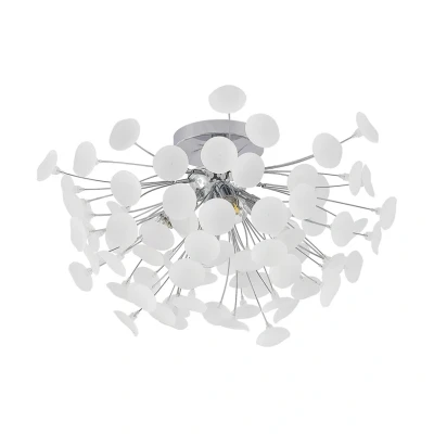Lights.coPlayful ceiling lamp Yurina made of iron and plastic The ceiling lamp Yurina convinces with its casual design of iron and plastic. It hangs on a discreet, round ceiling mount and merges into many narrow struts, each of which ends in frost-colored elements. Amidst the bundle sit four sockets, each of which can hold an E14 bulb. The light generated by these bends through elements and generates an interesting play of light. The simple colour combination of frosty white and classic chrome create an elegant character and integrate effortlessly with the rest of the furniture. The modern design sets harmonious accents on apartment ceilings and adds something special to any room. It finds the perfect place especially in a living room, but also cuts a fine figure in other rooms.