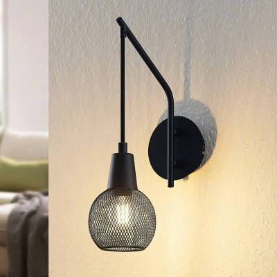 Modern Zerda wall lamp with hanging spherical mesh lampshade Zerda impresses with its modern look and pleasant, cosy lighting effect. Both the frame and the lampshade are made of iron and are black, but the spherical lampshade with its fine mesh structure allows some light to pass through and also embodies a pleasant lightness. The light is particularly pleasant and slightly dimmed. Overall, the wall lamp has a contemporary look and the lampshade hanging into the room creates a very individual expression. The light can be used in many places in the living area and is also a beautiful eye-catcher in a commercial environment.