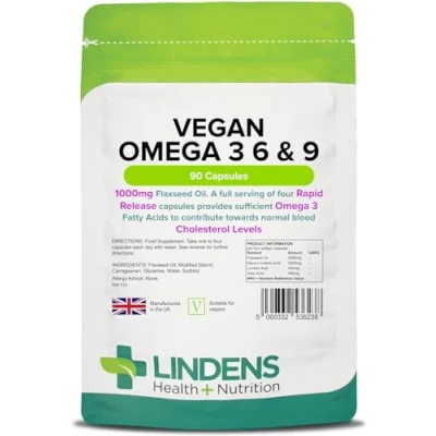 Lindens Vegan Omega 3, 6 & 9 Flaxseed 1000mg Softgel Capsules 90 Rapid Release UK Manufacturer, Letterbox Friendly