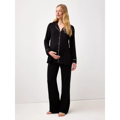 LindexONLINE EDITION. A soft and comfy pyjama set including a long sleeve pyjama top with a collar and trousers with a wide, foldable trim supporting the growing belly.