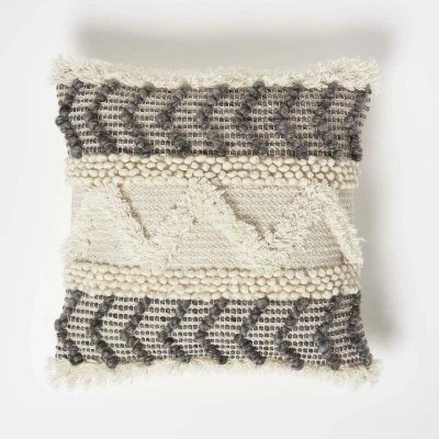 Specifications : Brand : Homescapes Colour : Cream, Grey Size : 45 x 45 cm Cover Material : 45% Wool & 55% Cotton Cover, Polyester Insert Filling : Super Microfibre Cushion Insert Pack Includes : One filled cushion Care Instructions : Spot clean only Pattern : Kilim Pack Size : 1 Cushion An exclusive collection of colourful and neutral, traditionally handwoven kilim cushions from Homescapes. These durable, hardwearing cushions are woven from a luxury 100% cotton and pure wool blend that creates a tapestry-style cushion, perfect for everyday use. Featuring a traditional textured design that echoes Indian, goemetric and tribal patterns, these colourful cushions are sure to make a statement in any home. Filled with a super soft hypoallergenic super microfibre cushion insert, these heavy-weight cushions are both practical and comfy and will not flatten over time. A range exclusively designed by Homescapes, each cushion cover is expertly handwoven on traditional handlooms, resulting in a