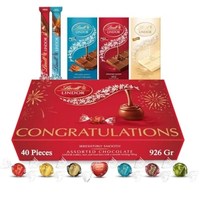 WHAT'S INSIDE: Celebrate success with this 926g premium assortment of 40 Lindt Lindor truffles and bars, including Milk, White, Dark, Salted Caramel chocolates and more. A complete chocolates gift box designed for sharing and celebrating milestones. CELEBRATE IN STYLE: Each Lindor chocolate truffle offers a silky-smooth texture and irresistible flavour. Perfect as a celebrations chocolate gift, thank you present, or congratulations hamper for friends, colleagues, or loved ones. VERSATILE PREMIUM GIFT: Ideal for graduations, new jobs, weddings, or achievements. This premium chocolate hamper delivers a touch of class and indulgence to every congratulatory moment. ELEGANT PRESENTATION: A beautifully packaged chocolate gift box ready to give without extra wrapping. Suitable for any gender or age, this luxury Lindt chocolates selection box makes every occasion memorable. THE LINDT STORY: Since 1845, Lindt’s Master Chocolatiers have created exquisite chocolates using the world’s finest cocoa and ingredients. Every Lindor chocolate truffle represents a moment of bliss and craftsmanship. Lindt chocolates are known globally for their smooth texture, elegant taste, and iconic Swiss quality.