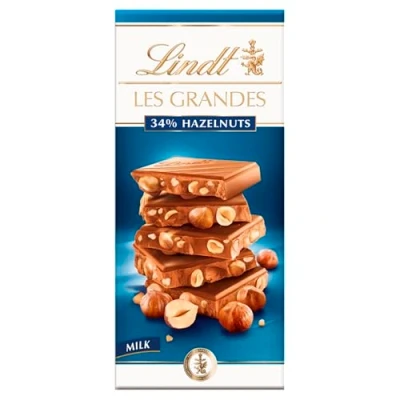 Lindt Les Grandes Milk Swiss chocolate bar with whole hazelnuts roasted to perfection and crunchy caramelised hazelnut pieces Made only with the most premium ingredients, including 34 percent hazelnuts and high quality cocoa beans Ideal for everyday enjoyment, when you want to treat yourself or share a little moment of indulgence with your friends and family The balance of flavours makes this an ideal chocolate bar for nut and chocolate lovers looking for pure moment of pleasure Store in cool, dry place