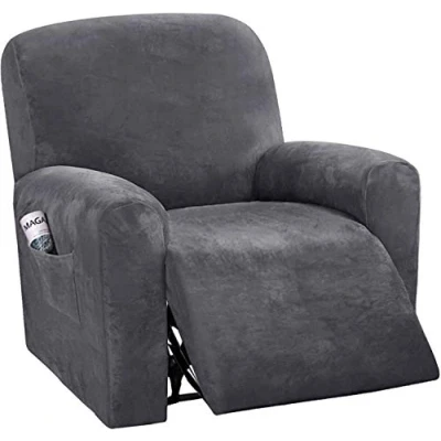 LINGKY 4 Pieces Recliner Chair Covers Velvet Stretch Armchair With Side Pocket Thick Soft Washable Sofa 1 Seater Replacement Furniture Protector (Armchair, Gray)