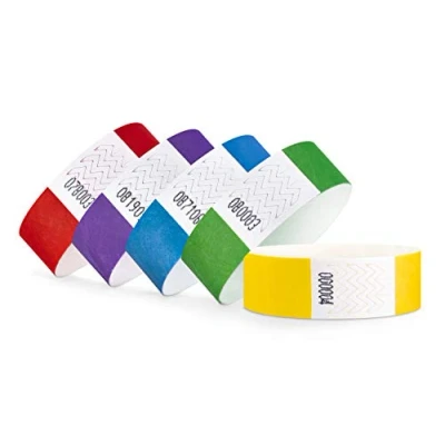 100 PIECES IN A SET: The Basic Pack contains 5 different standard colours, 20 pieces of each. 10 control wristbands per sheet. DURABLE: The bands are tear- and waterproof and last for several days. EASY TO APPLY: Our admission wristbands can be fastened quickly and securely with a practical adhesive fastener. No tools are required. SECURE: Each wristband is individually numbered and tamper-proof. Thanks to the perforation on the fastener, it is easy to see if the wristband has been opened previously. POSSIBLE APPLICATIONS: The event wristbands are ideal as admission control bands, emergency wristbands for children, as banderoles for banknotes, or name tags for luggage.