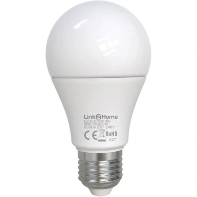 ManoManoGeneral description The Link2Home Wi-Fi LED Dimmable Bulb with RGB allows you to adjust the white light spectrum from a warm 2,700K to a cool 6,500K. It offers over 16 million color options, which can be easily controlled via the Link2Home Pro app. This bulb is designed for versatility, making it suitable for home, office, or commercial use where customizable lighting is desired. Technical specifications Fitting: E27 (ES) Input Wattage: 9W (equivalent to 60W) Lumens of Light: 800 lm Average Rated Life: 15,000 hours White Light Colour Temperature: 2,700K - 6,500K (Warm to Cool) Dimmable: Yes Beam angle: 200° Color rendering index (Ra): >80 Power factor: >0.5 Standby wattage: