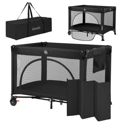 2-IN-1 BABY COT & PLAYPEN – The Lionelo Laura is a practical portable travel cot that doubles as a safe playpen. Thanks to the adjustable mattress height, it grows with your child — the upper level for newborns (up to 9 kg) and the lower for toddlers (up to 15 kg). COMPACT & LIGHTWEIGHT DESIGN – Slightly smaller than standard cots (102 × 72 × 74 cm) yet spacious inside for comfort. Weighing only 8.1 kg, it’s ideal for smaller homes or holidays. Folds quickly and fits in the included carry bag with handle for easy storage and travel. THICK & COMFORTABLE MATTRESS – Comes with a 2 cm T25 foam mattress (25 kg/m³ density) providing stable spinal support and gentle softness for restful sleep. Durable, supportive and perfectly balanced for everyday use. BREATHABLE & PRACTICAL DETAILS – All-round mesh panels guarantee airflow and clear visibility. A side zip entrance lets older children climb in and out independently, boosting confidence and freedom to play. EASY TO MOVE & BUILT TO LAST – Two lockable wheels ensure effortless repositioning and secure stability. A detachable hanging organiser keeps essentials within reach. The sturdy steel frame with Oxford 300D fabric makes the cot durable, wipe-clean and ready for daily use.