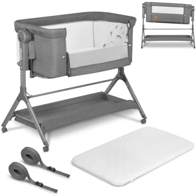 3-IN-1 COT: BEDSIDE, ROCKING & STANDALONE – Use as a co-sleeper with a drop-down side, switch to rocking crib, or lift the side for a standalone baby bed; ideal from birth until baby starts sitting up. FIXED-LEVEL ROCKING = GENTLE, EVEN SOOTHING – The cradle moves horizontally so the mattress stays level (no tilting) for safe comfort while rocking your little one to sleep. SUPPORTIVE T25 FOAM MATTRESS & MESH SIDES – Semi-firm T25 foam supports healthy posture; breathable mesh panels improve airflow and visibility for peaceful naps day and night. EASY NIGHT FEEDS: 6-LEVEL HEIGHT + WHEELS – Align to your bed with 6 height settings, secure with straps, and glide between rooms on 4 lockable rubber wheels that protect floors. HYGIENIC & PRACTICAL – Removable, washable cover, large under-cot storage basket for essentials, reflux-friendly 2-step incline, and a stable aluminium frame; safety tested to EN 1130 / EN 16890.