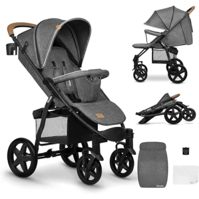 ALL-TERRAIN COMFORT: Tackle any surface effortlessly with durable EVA foam wheels and shock absorbers on all sides, ensuring a smooth, vibration-free ride for your little one, even on rough ground. MAXIMUM SAFETY: Keep your child secure with the 5-point harness and the convenient Easy Stop brake that can be activated with just one foot for quick, safe stopping. XXL CANOPY FOR EXTRA PROTECTION: The extra-large, adjustable canopy offers superior coverage against wind, rain, and sun, while the transparent window lets you check on your baby at all times. FROM NEWBORN TO TODDLER: Suitable from birth up to 22kg, the stroller features an easy-to-adjust reclining backrest and footrest for your child’s comfort, ensuring the perfect fit from day one. TRAVEL-READY DESIGN: Lightweight, easy to fold, and complete with a mosquito net, footmuff, and cup holder, this stroller has everything you need for family outings and daily adventures.