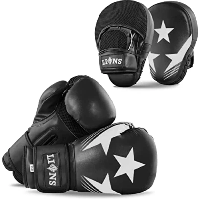 Lions Boys Boxing Gloves and Pads Set of Sparring Punching Mma Focus Hook & Jab Training Mitts (WHITE MAXSTAR, 10OZ)