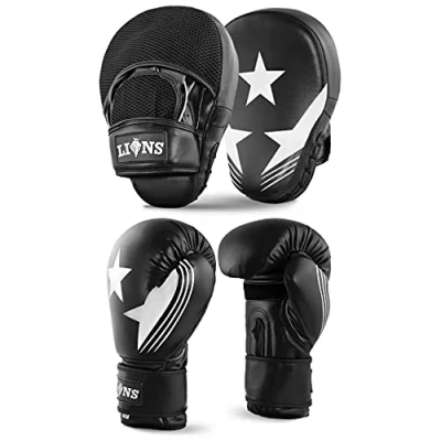 Lions Focus Pads and Gloves Set Boxing Hook Jabs Sparring Punch Martial Arts MMA Punching Mitts Muay Thai Kickboxing Coach Glove Sets for Men Women (WHITE MAXSTAR, 10OZ)