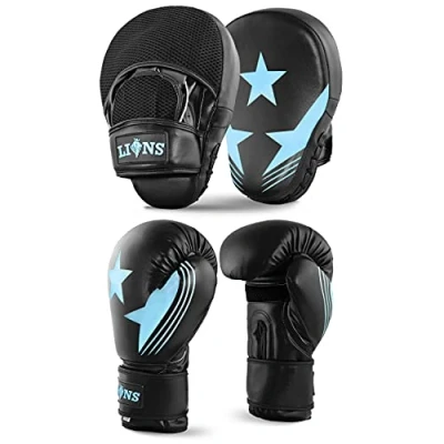 Lions Star Boxing Gloves and Pads Set for Men Women, Pair of with Hook Jabs Mitts Focus Pads, Punching Sets Ideal Punch Bag MMA Martial Arts (Blue, 10oz)