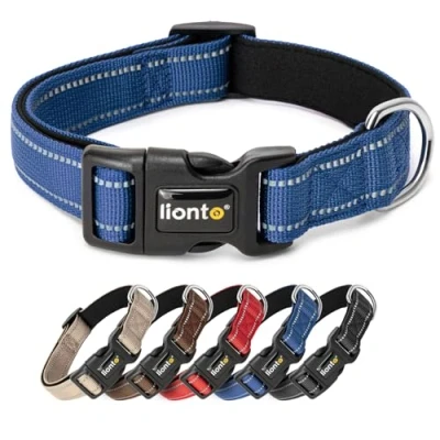 lionto Durable Nylon Dog Collar, Extra Small, Soft Padded Collar for Dogs, 360 Reflective & Click Closure, Metal Ring Adjustment by Continuous Slider, Blue