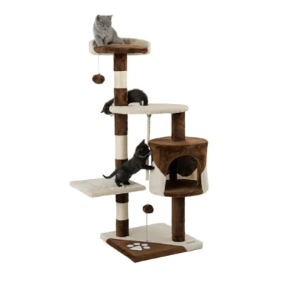 lionto Scratching tree for cats with 2 plush balls & play rope, height 112 cm, cat sisal rope plush, cozy lying area cave, incl. wall mount, small large cats, brown/beige