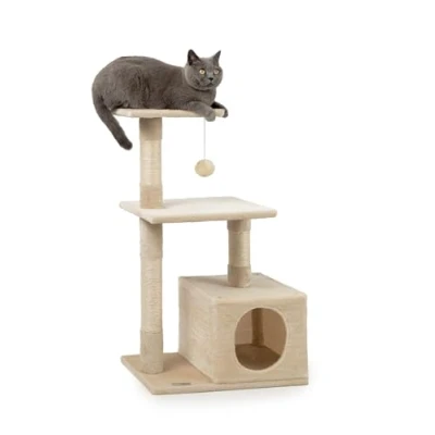 𝗖𝗢𝗠𝗙𝗢𝗥𝗧 𝗭𝗢𝗡𝗘. This cat scratching tree with soft plush and ideal activity options enables species-appropriate playing, resting and hiding. 𝗣𝗟𝗔𝗬 + 𝗥𝗘𝗦𝗧 𝗣𝗔𝗥𝗔𝗗𝗜𝗦𝗘. This cat tree with a plush play ball satisfies your cat's urge to play and hunt. A cave and two plateaus invite your cat to take a rest, and there is also plenty of room for the favourite activity of watching. 𝗢𝗣𝗧𝗜𝗠𝗔𝗟 𝗖𝗟𝗔𝗪 𝗖𝗔𝗥𝗘 𝗪𝗜𝗧𝗛 𝗦𝗜𝗦𝗔𝗟. The hard-wearing sisal trunks of the cat play tower provide the necessary claw care and ensure that your furniture is spared. 𝗦𝗣𝗔𝗖𝗘-𝗦𝗔𝗩𝗜𝗡𝗚 𝗘𝗬𝗘-𝗖𝗔𝗧𝗖𝗛𝗘𝗥. With a height of 85 cm, this scratching post fits perfectly into any room and provides a pleasant sight with a feel-good guarantee for animals and humans. 𝗗𝗜𝗠𝗘𝗡𝗦𝗜𝗢𝗡𝗦 + 𝗖𝗢𝗟𝗢𝗨𝗥𝗦. The durable climbing tree measures 50x30x85 cm and is available in beige, brown, light grey and dark Grey.