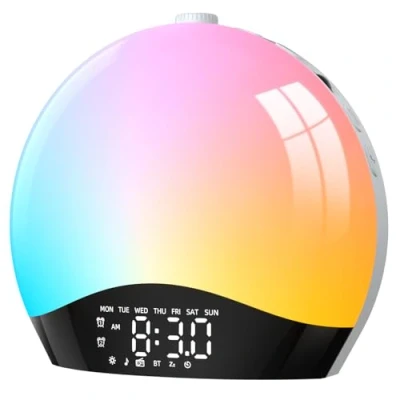 Sunrise & Sunset Simulation - Set an alarm time, the sunrise simulation light of the sunrise alarm clock will gradually increase from 0 to full. When go to bed, you can choose fall asleep mode, the light will gradually dim from full to 0(Max time: 480 minutes) 8 Colorful Light & 9 Dynamic RGB - The wake up light sunrise alarm clock has 8 colorful light: pink, green, blue, indigo, purple, grey, red and orange. 9 dynamic RGB atmosphere light and 20 levels of brightness can suit your different needs BT Connection - The wake up light alarm clock has added BT function, you can connect the sun alarm clock to your phone for automatic time syncing and enjoy high-quality music FM Radio - Enjoy your favorite radio station with the built-in FM radio of the sunlight alarm clock, supporting 76-108MHz and automatic station memory White Noise Function - The light up alarm clock has added white noise function. Fall asleep with relaxing white noise, and the sunrise lamp will gradually dims the light and music over time, ensuring a peaceful sleep Dual Alarms & Weekend Mode - The sunrise alarm clock has dual alarms, so you can set 2 independent alarms for different scheduling. With weekday display and weekend mode, the alarm clock will not disturb your rest on weekends