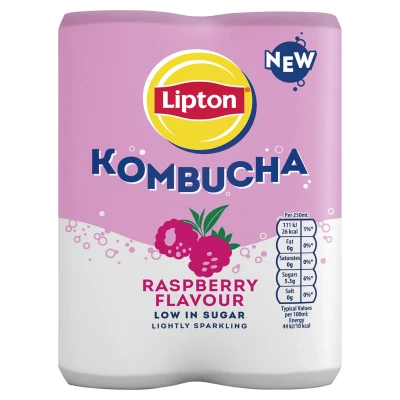 Lipton Kombucha Raspberry 4 x 250ml is a lightly sparkling, naturally fermented tea drink with real raspberry juice and live cultures for gut health, offering a crisp, tangy flavor. Ideal served chilled, it's perfect for on-the-go refreshment, sharing, or enjoying with meals.