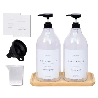 Make Your Laundry Room Your Happy Place: Why settle for a drab, boring laundry room? Liven it up with our decorative set: 1 liquid detergent dispenser, 1 fabric softener dispenser, plus 1 beautiful bamboo tray; All 3 pieces boast stylish designs with sleek, elegant lines, so they can help transform any space from bare to beautiful Set It Up In Seconds: Your laundry detergent container set arrives all ready to use, with water-resistant labels pre-attached to both bottles; Simply pour liquid detergent or softener into each bottle through the collapsible funnel (included); Then attach your preferred tops (included) – screw-on caps or pump heads – and you're good to go Exclusive Bamboo Tray Adds Natural Charm: Unlike most sets, our laundry detergent storage container bundle includes a genuine bamboo tray; With its rich golden hue, this gorgeous tray will warm up any setting; Plus, it's just the right size to hold our 2 half-gallon dispensers, so it's ideal for keeping your laundry room neatly organized Built Tough to Go the Distance: Our 2-pack laundry containers for detergent are designed for years of use; Both 64-oz. bottles feature super-strong PET plastic, highly resistant to breakage and free of all harmful chemicals; Plus, we include 2 additional blank labels, so you can repurpose your bottles for shampoo, lotion, body wash, etc. Enhance Your Home Without Busting Your Budget: Like you, we believe an organized home is a happy home; That's why we bring you affordable products that help reduce clutter while adding decorative charm; Case in point: this liquid laundry soap dispenser set; We're sure you'll love it, but if you don't, just return it for a refund or replacement, Manufacturer: HappyHome
