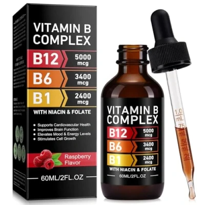 Liquid Vitamin B Complex Drops High Strength Supplement, B12, B6, B1, Niacin & Folate, Supports Energy Immune Support Non GMO, Gluten Free Vegan for Men Women, Raspberry Flavour (60ml)