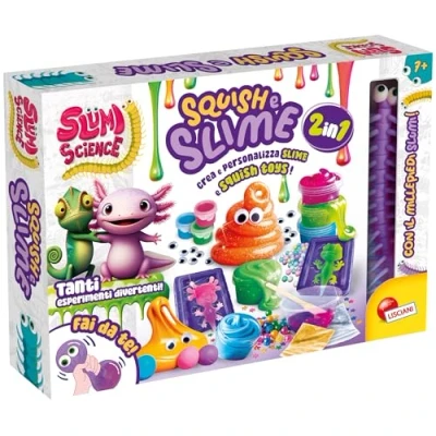 2 in 1: squish and slime to create and decorate DIY squish kit; different types of slime; lots of decorations to make your own squish and slime; rich illustrated manual; with the slumi centipede Squish glue a, squish b glue, small bowls, spatulas, colours, axolotl and chameleon molds, plastic eyes, silver pallettes, colored pallets, holographic pallets, colored balls, double-sided foil, slime goo, super slime, super dough, butter slime, super putty, illustrated manual Scientific experimentation, animal characteristics, observation, creativity, chemistry concepts, fine dexterity, Manufacturer: Liscianigiochi Italy