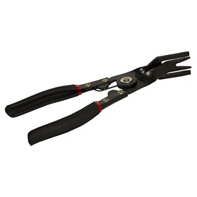 Ergonomic spring loaded handles are rotated 90 degree to provide leverage needed to easily remove push in fasteners The tapered forked end makes getting under the clips easier and helps prevent damage to the clips or door panel Works on a wide range of push in clip sizes