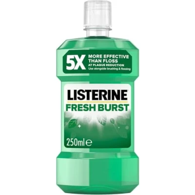Listerine is the 1# mouthwash brand in the UK & Ireland*. This Listerine mouthwash is designed to kill up to 99% of bacteria that cause plaque and bad breath left after brushing with plaque reduced by up to 56% more than brushing alone Maintain healthy gums with the formula of this daily mouthwash which also helps provide long-lasting fresh breath confidence when used twice daily The Listerine Fresh Burst mouthwash is proven to be 5x more effective than floss at reducing plaque** (**Germ kills provides sustained plaque reduction above the gumline after a dental cleaning. Use alongside brushing and flossing) How to use: Pour 20ml (4 x 5ml teaspoonfuls) of Listerine mouthwash into a glass, rinse around teeth and gums for 30 seconds, then spit out. Especially effective when used morning and evening after brushing Product details: Listerine Fresh Burst Mouthwash (250ml), helps to kill plaque- and bad breath-causing germs to maintain healthy gums and lasting fresh breath confidence
