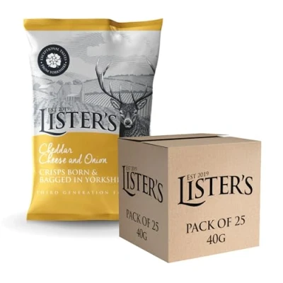 Listers Crisps Cheddar Cheese & Onion (Box of 25 x 40g Snack Bags), Made in the UK, Vegetarian