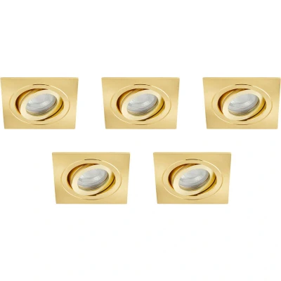 General description Bring a sophisticated glow to your interiors with these Recessed Tiltable Square Spotlights in Satin Brass. This 5-pack is designed for those who appreciate both form and function, offering adjustable lighting with a luxurious satin brass finish. Ideal for modern and classic settings alike, these spotlights are perfect for highlighting artwork, architectural details, or creating a cozy ambience. Technical specifications Product Type: Recessed Downlight Bulbs Required: 5 (Not Included) Bulb Type: GU10 Max Bulb Wattage: 7 Watt Max Bulb Voltage: 240 Volt Light Source: LED Width: 9.2 cm approx. Length: 9.2 cm approx. Cut Out Diameter: 7.8 cm approx. Recessed Depth: 11.5 cm approx. Material: Metal, Glass Colour: Satin Brass IP Rating: IP65 Rated for safe use in bathrooms (Class II Double Insulated) Dimmable: Yes (With appropriate bulb & switch)
