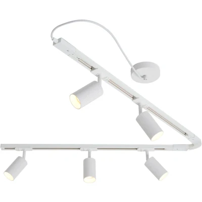 General description Improve practicality in your home with the Bexley 1.8m Flexible Track Kit with 5 Heads in White. This track light kit allows you to illuminate difficult right, obtuse, and acute angle corners of your home. Featuring five adjustable spotlight heads, you can direct the lighting in any direction, providing both contemporary style and useful illumination. Technical specifications Product Type: Track Light Kit Bulbs Required: 5 (Not Included) Bulb Type: GU10 Bulb Wattage: 7 Watt Max Bulb Voltage: 240 Volt Height: 1.5 cm approx Length: 183 cm approx Width: 3.5 cm approx Material: Metal Colour: White Spot Length: 10.5 cm approx Spot Height: 24 cm approx Spot Width: 6 cm approx Weight: 2.64 kg