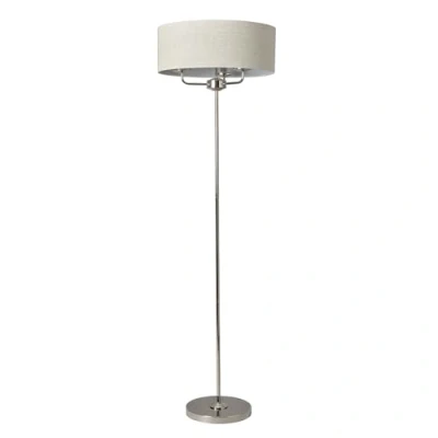 Give your space a modern upgrade with the Celia 3 Light Floor Lamp in Polished Nickel. This elegant floor-standing lamp stands out with its slim metallic frame and a wide fabric drum shade in a natural tone, housing three lights for balanced lighting. Perfect for creating a warm, inviting atmosphere, its streamlined design fits effortlessly into living rooms, bedrooms, or reading corners. Combining contemporary style with practical illumination, this floor lamp is a versatile choice for homes that value both aesthetics and functionality. Product Type: Floor Lamp Bulbs Required: 3 (Not Included) Bulb Type: E14 Small Edison Screw Max Bulb Wattage: 6 Watt, Max Bulb Voltage: 240 Volt Light Source: LED Height: 162 cm approx. Base Diameter: 28 cm approx. Shade Height: 18 cm approx. Shade Diameter: 48 cm approx. Material: Metal, Fabric Colour: Polished Chrome, Natural Technical Information Features Inline On/ Off foot switch Weight: 5.68 kg