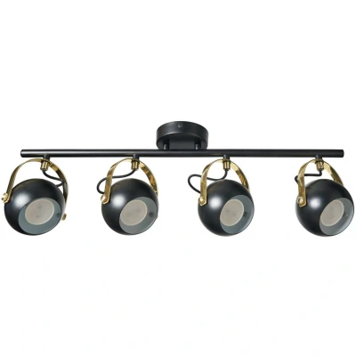 General description Add character to your space with this 4-light eyeball spotlight in black and satin brass. The adjustable heads and GU10 bulb compatibility offer flexibility in directing light, making it perfect for showcasing specific areas or objects in kitchens or hallways. The semi-flush design makes it ideal for low ceilings. Technical specifications Product Type: Spotlight Bar Bulbs Required: 4 (Not Included) Bulb Type: GU10 Max Bulb Wattage: 7 Watt Max Bulb Voltage: 240 Volt Light Source: LED Height: 20 cm approx. Width: 12 cm approx. Length: 65 cm approx. Ceiling Cap Diameter: 10 cm approx. Drop: 20 cm approx. Shade Height: 8 cm approx. Shade Diameter: 10 cm approx. Material: Metal Colour: Black, Satin Brass Weight: 1.44 kg