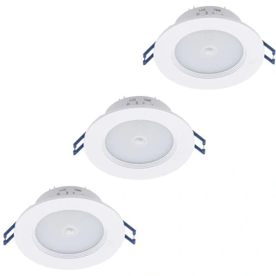 General description Welcome innovative lighting into your home with the 3 Pack of Jeune Recessed LED Downlighter with 360 Degree PIR Sensor in White. Featuring a PIR sensor, these recessed downlights automatically turn themselves on when motion is detected. With an adjustable LUX, you can utilize these lights without the need for switches. Technical specifications Product Type: Recessed Downlighters Bulbs Required: 3 (Integrated Non Replaceable) Bulb Type: Integrated LED Max Bulb Wattage: 8 Watt Max Bulb Voltage: 240 Volt Light Source: LED Diameter: 10.5 cm approx Cut Out Diameter: 7.9 cm approx Recessed Depth: 4.8 cm approx Lumen: 500 lm Energy Efficiency Rating: A++ Colour Temperature: 4000 k Cool White Material: Polycarbonate Colour: White Detection Range: 6m Adjustable Timer and Brightness